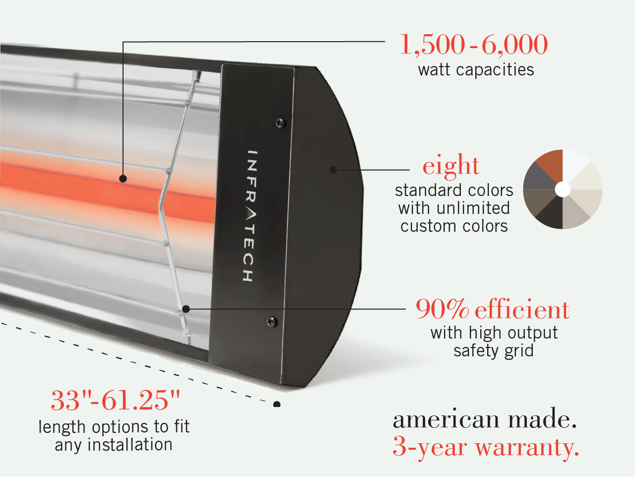 C/CD-Series heaters are available in a range of colors, to coordinate with your interior or exterior environment. Choose from brushed stainless steel or eight standard color finish options.